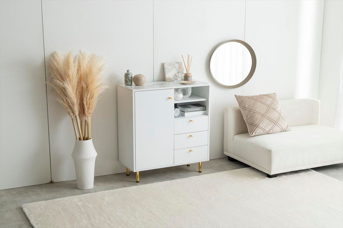 天板の大理石柄とゴールドのあしらいが特徴の『Camila(カミラ)』シリーズのキャビネット