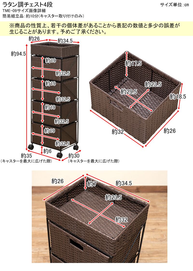 組立式(約10分(キャスター取り付けのみ)/付属の工具にて取付け)1個口