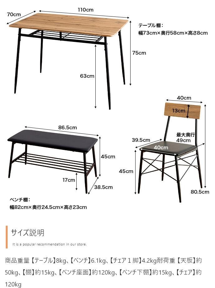 【商品重量】テーブル:11.64kg、ダイニングベンチ:6.1kg、チェア:4.2kg