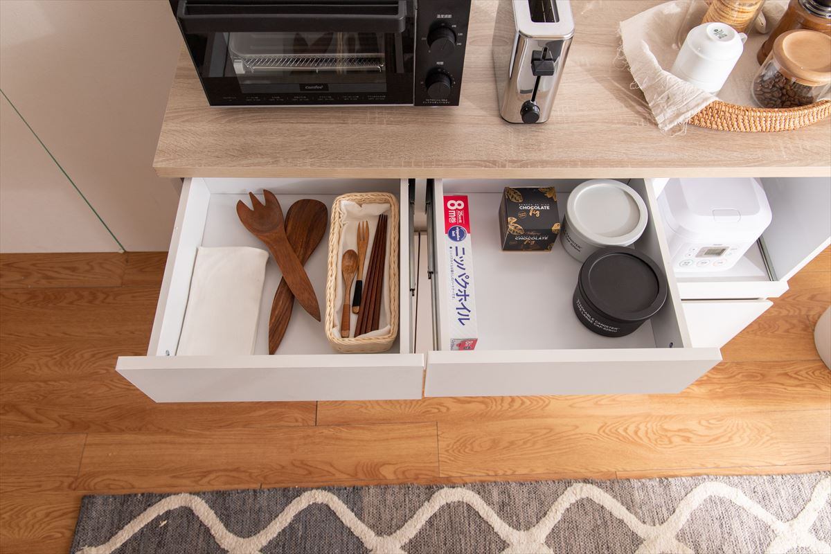 【耐荷重】天板:約30kg、上段引き出し:約3kg、スライドトレー:約10kg、