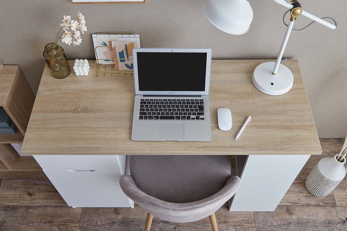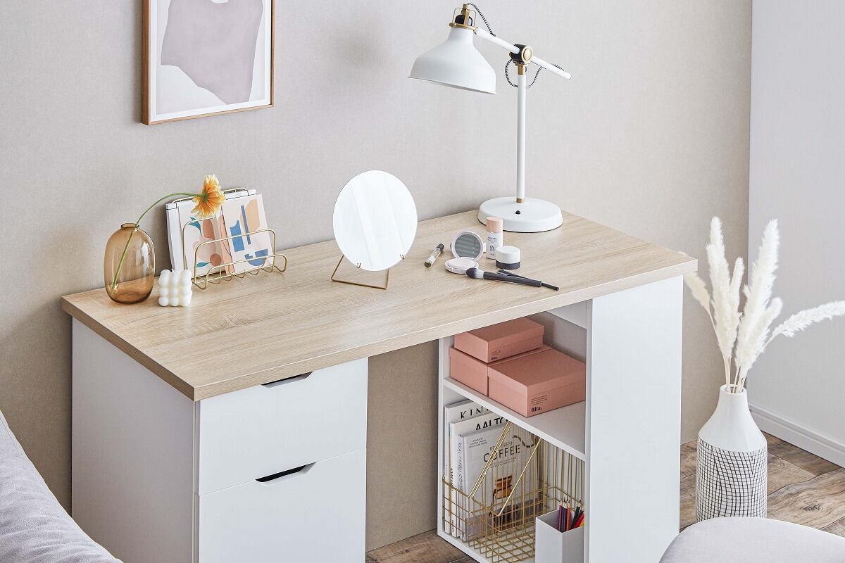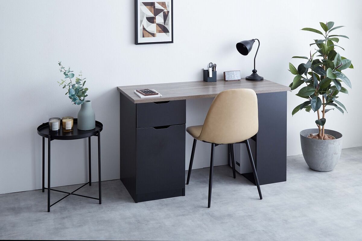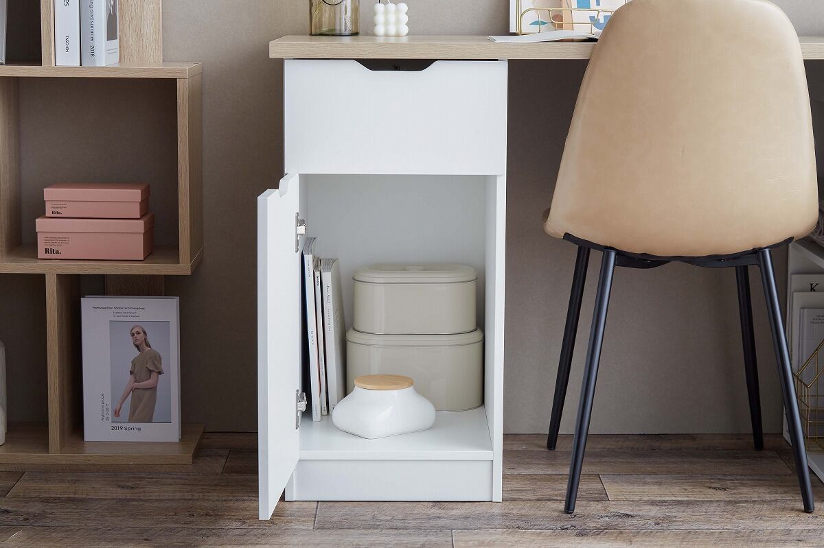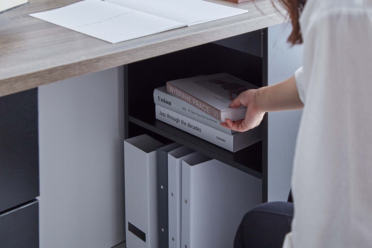 引き出し・開き扉収納・棚の3種類の収納スペースを備えた実用性の高い『Ella』収納付きデスク