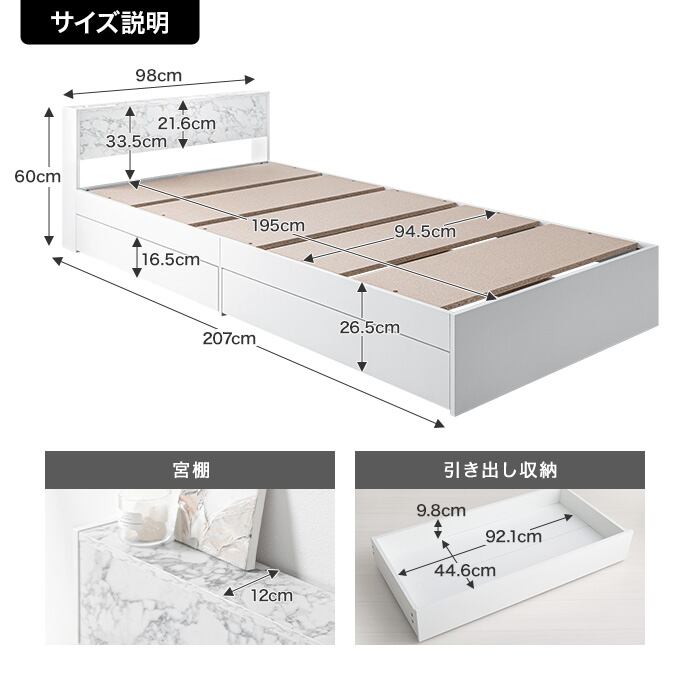 【シングル】Raffine 宮棚&コンセント付引き出し収納ベッド(マットレス付き)