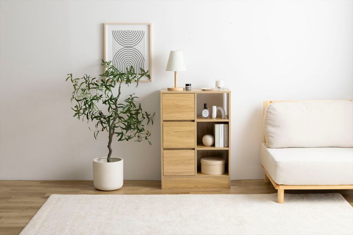 収納物に合わせて、隠す収納と見せる収納ができる『Sunap』シリーズの引出付きキャビネット