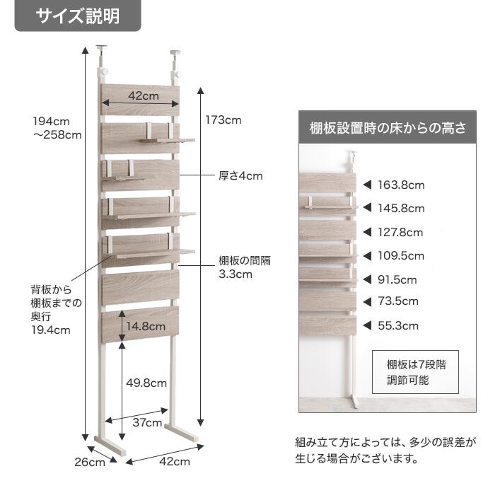 【耐荷重】棚板(幅42):約10kg 、棚板(幅21):約10kg 、帽子用フック:約5kg、S字フック:約5kg