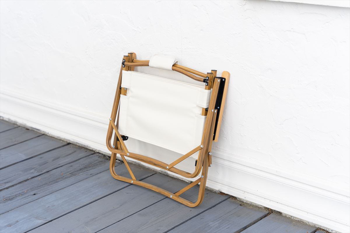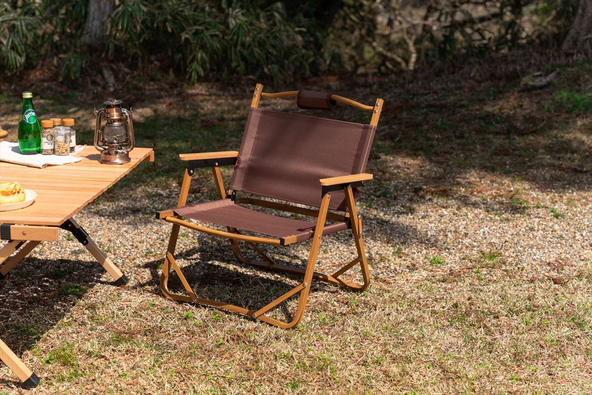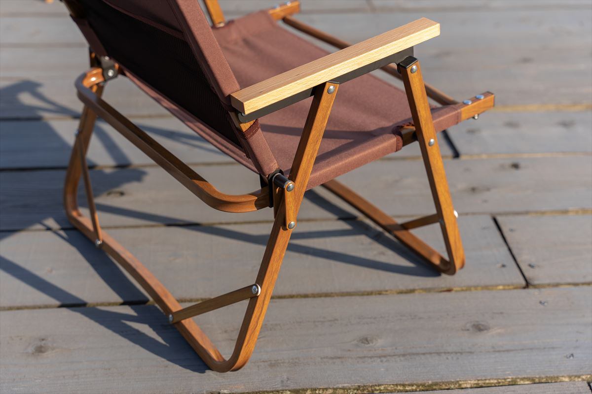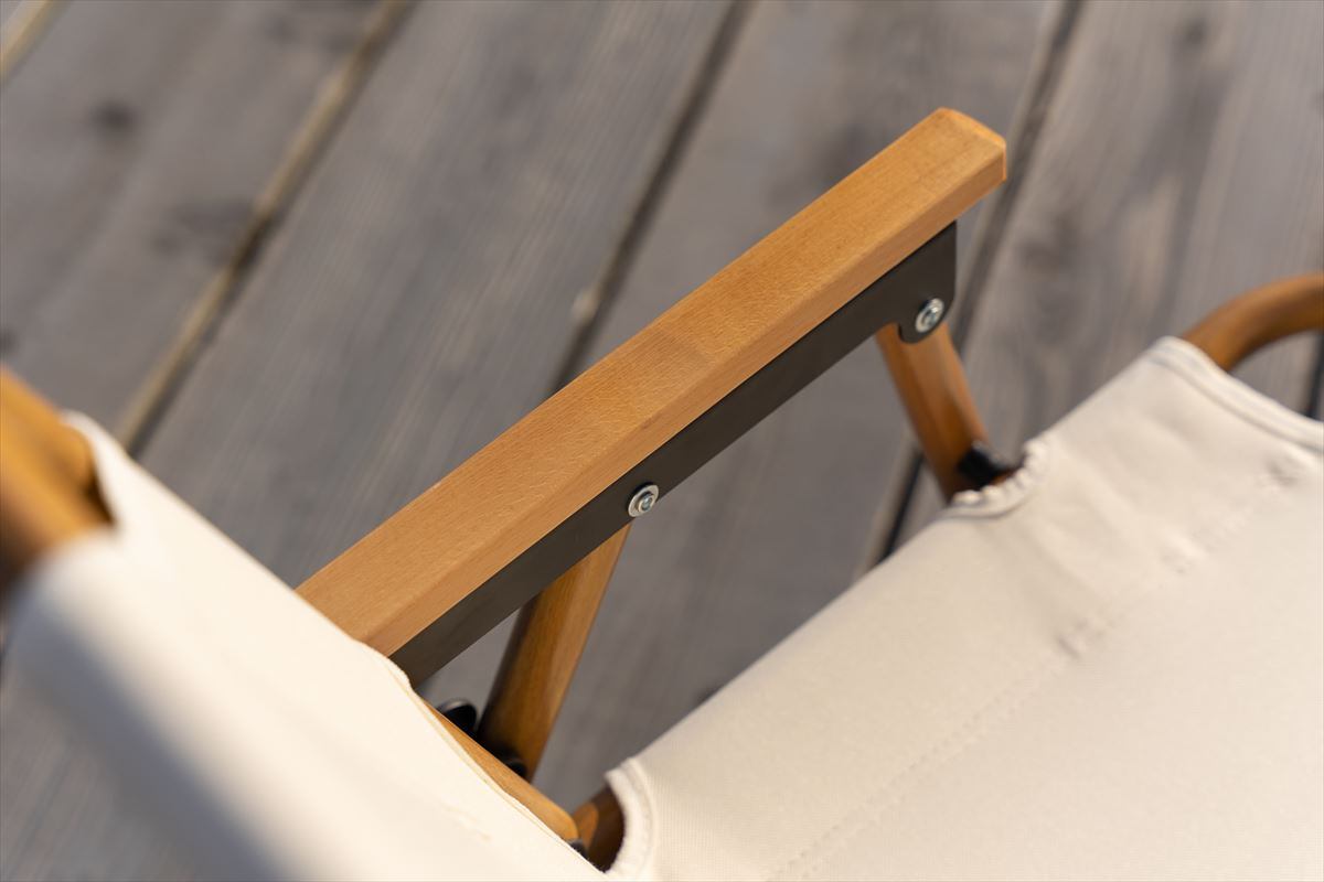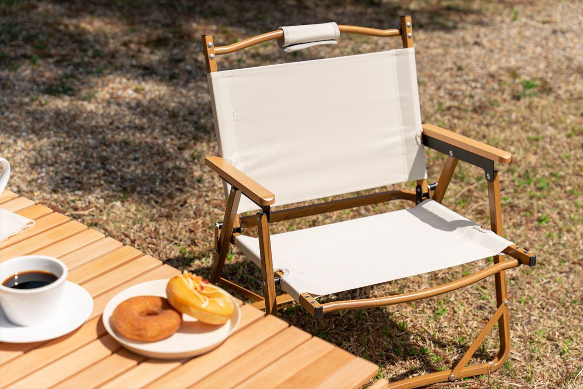 木目調のアルミフレームと天然木のアームレストがナチュラルな雰囲気を演出する折りたたみアウトドアチェア